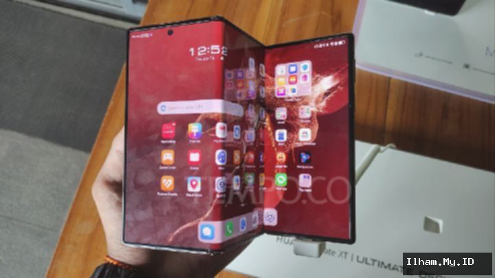 Pengunjung bisa melihat langsung ponsel lipat tiga Huawei Mate XT ini dalam Innovative Foldable Exhibition di Grand Indonesia.